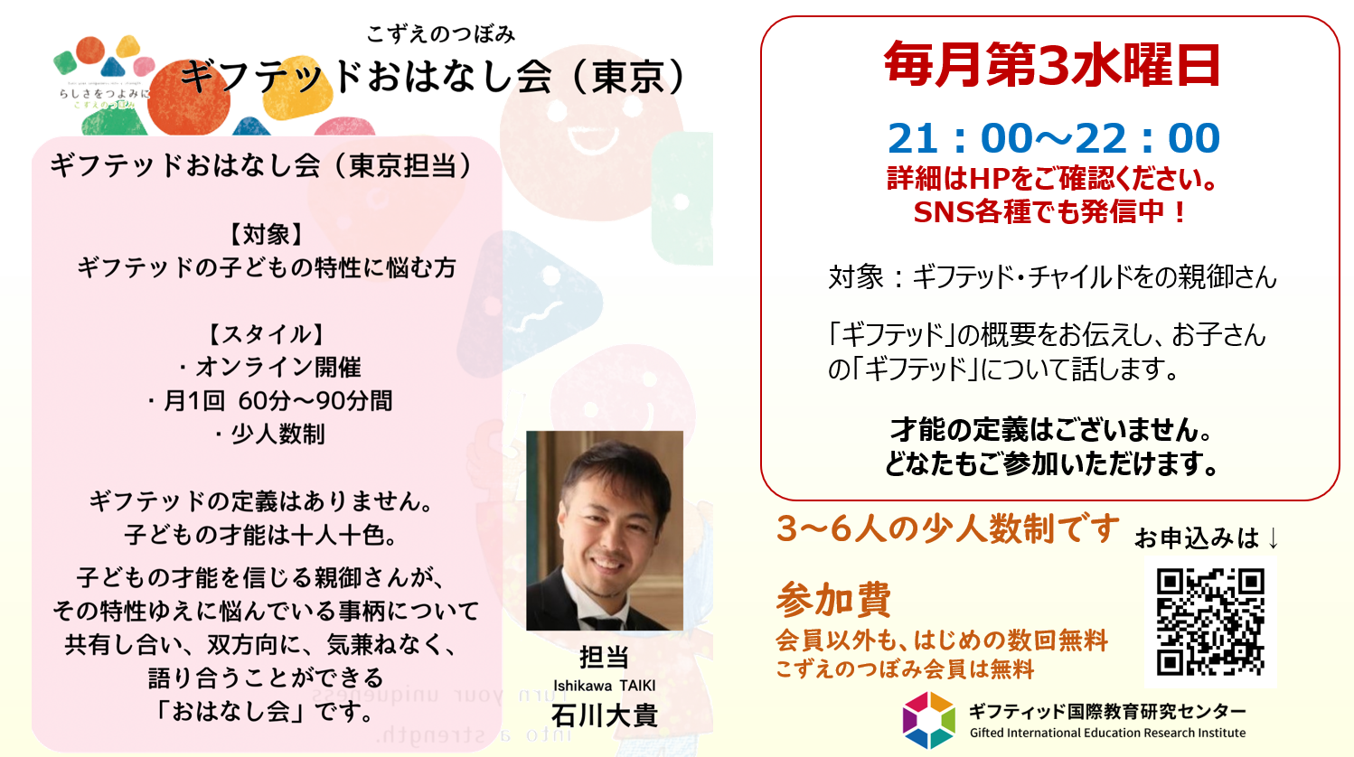 日時 対象 | 10月22日(水)21:00~22:00 11月19日(水)21:00~22:00 対象:ギフテッド・チャイルドをもつ親御さん | おはなし会の前に「ギフテッド」の概要についてお伝えした上で、お子さんの「ギフテッド」についてお話します。 ※オンライン開催 実施済み:3/5.19.20、4/16、5/21、6/18, 7/23, 8/27,9/17 |
